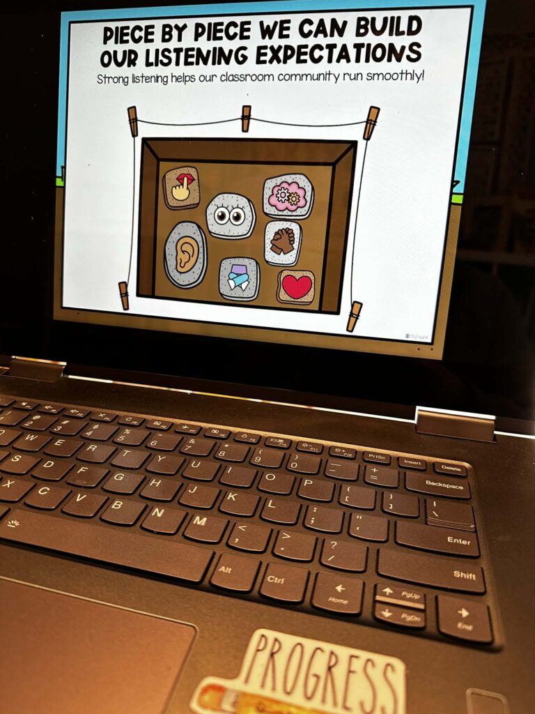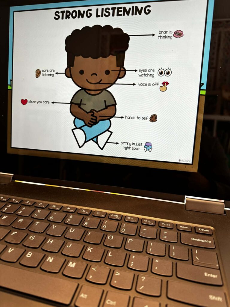 When students see a behavior, compare choices, and talk about it, it becomes more concrete. It gives them something to connect to instead of just another verbal reminder. Slides also create consistency. The language stays the same. The expectations stay clear. And students know exactly what you’re referring to when you revisit them.